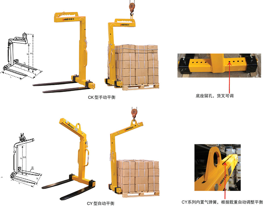 ● CK系列為手動平衡,根據(jù)貨物的重量不同,調(diào)整吊環(huán)所卡鋸齒位置。