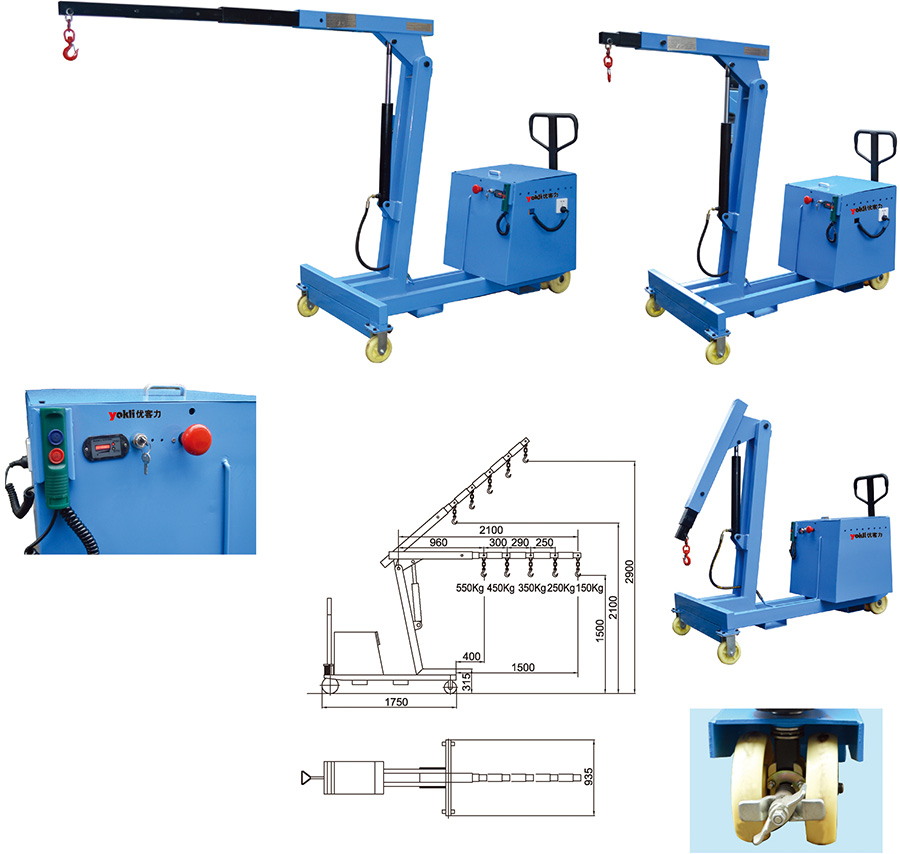 ● 吊臂長度可五工 位手動調(diào)節(jié),配有鍛造重載可旋轉(zhuǎn)吊鉤。
