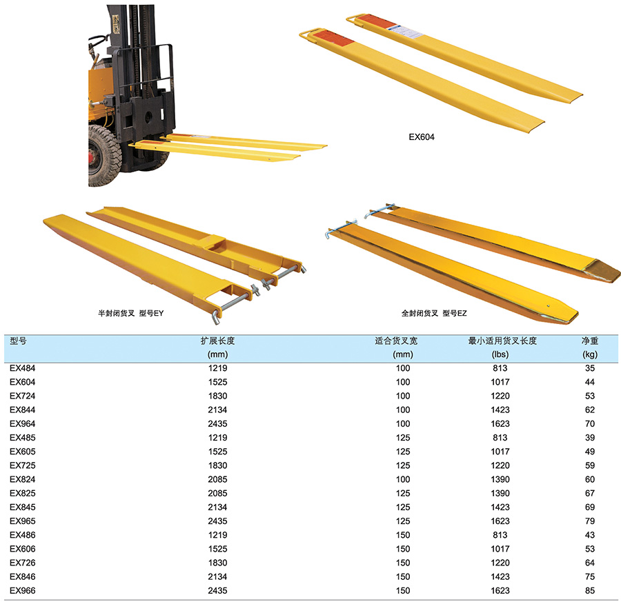 ● 端部焊有鋼性卡環(huán),確保使用過程中加長貨叉不會滑動。